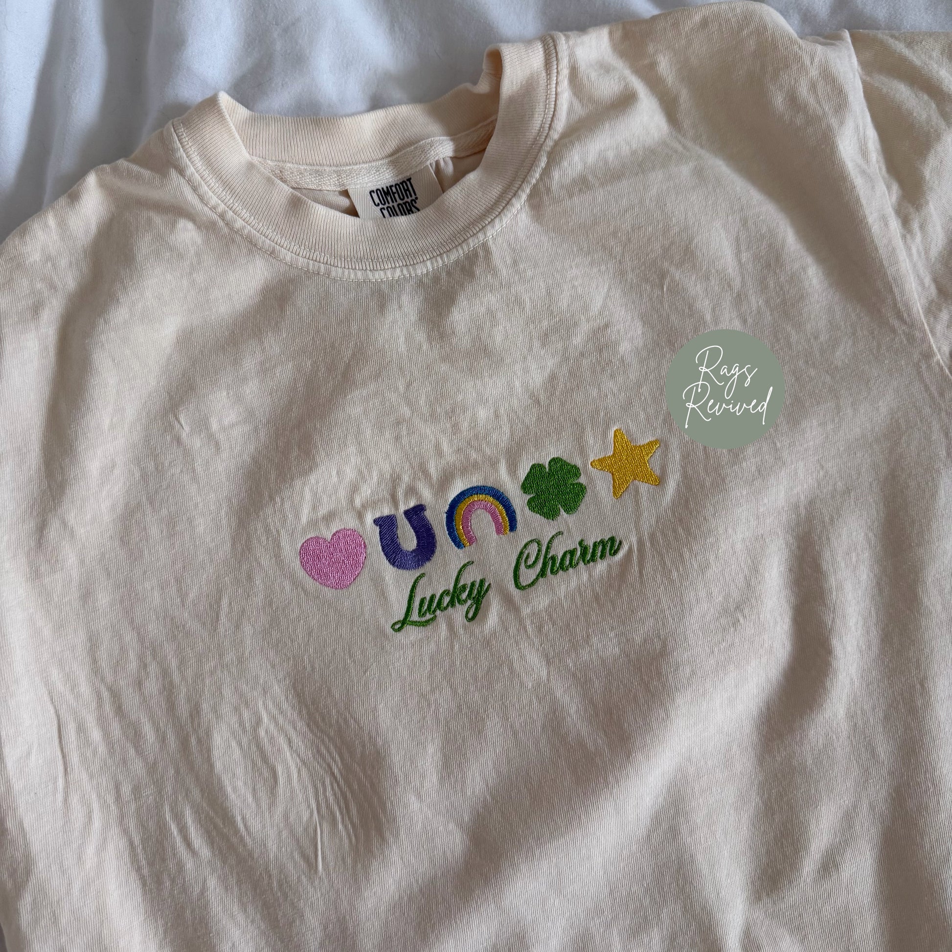 This boxy crop Comfort Colors womens t-shirt in ivory features a charming embroidered design paired with the phrase “lucky charm,” creating the perfect mix of cozy, playful, and effortlessly cool. Made with premium garment-dyed cotton, it has that lived-in feel you’ll love from the very first wear.